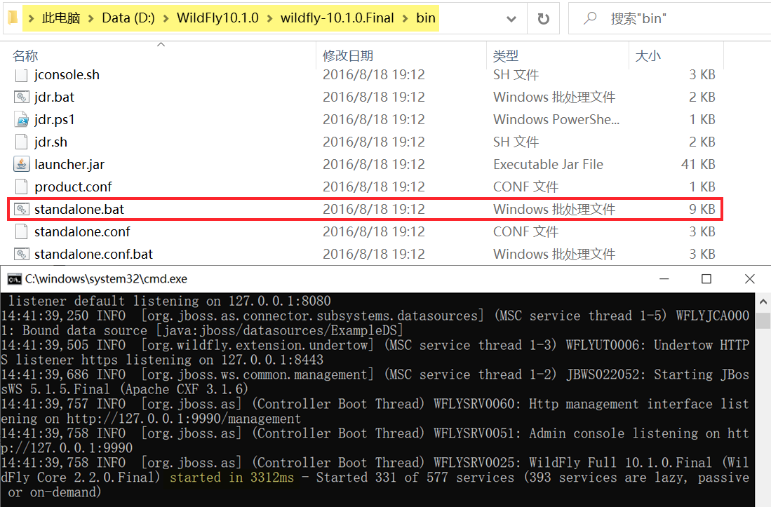 3)启动服务,验证是否配置成功。进入 bin 目录下,双击运行standalone.bat文件,看到如下日志,代表启动成功。如下图所示: