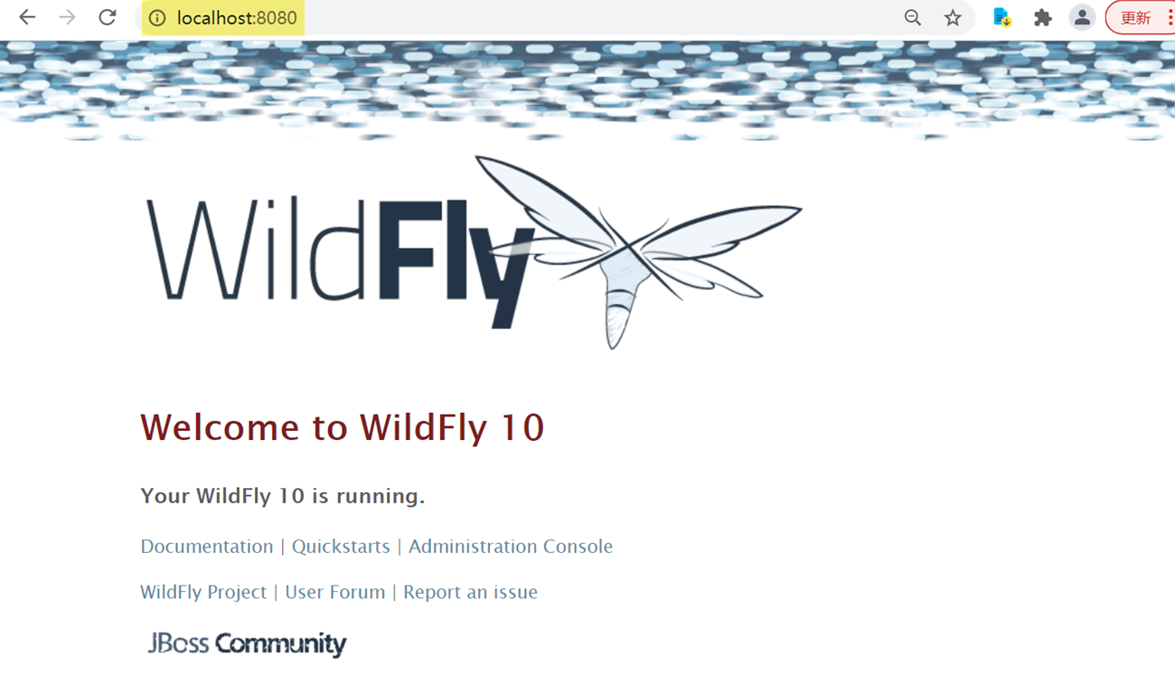 4)浏览器访问http://localhost:8080(WildFly 的 http 协议默认端口是 8080),出现下图所示画面代表服务器配置成功。