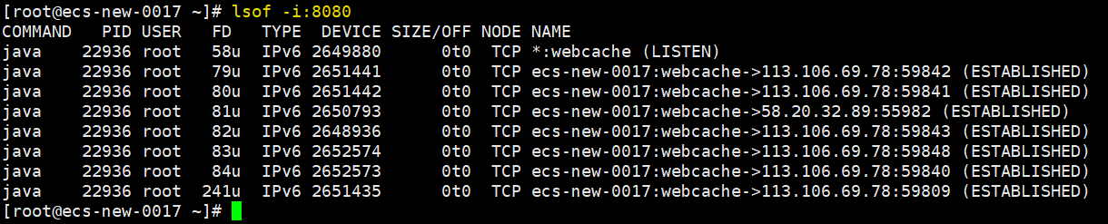 示例:lsof -i:8080,查看 8080 端口使用情况,占用 8080 端口的是进程号(PID)为 22936 的 java 进程。如下图所示: