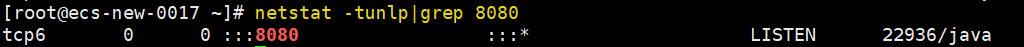 示例:netstat -tunlp|grep 8080,查看 8080 端口使用情况,占用 8080 端口的是进程号(PID)为 22936 的 java 进程。如下图所示: