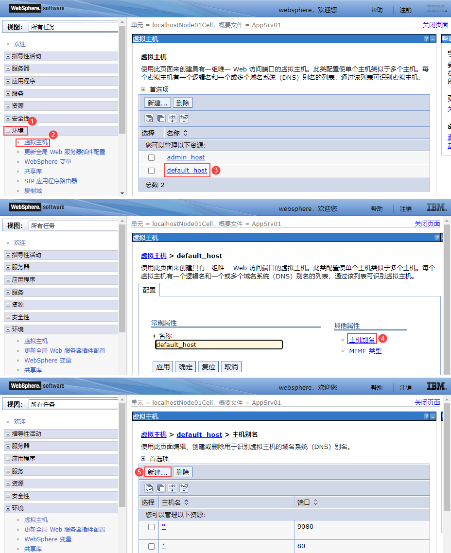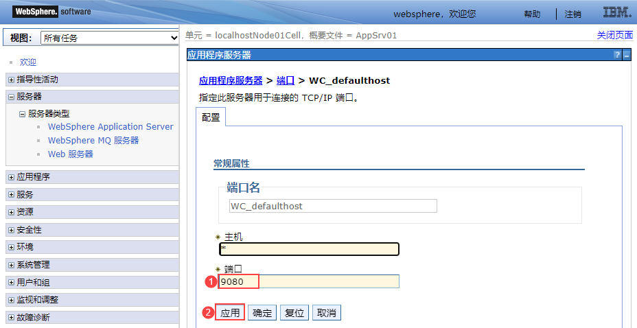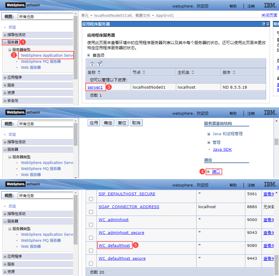 点击「通信>端口」,点击「WC_defaulthost」,如下图所示