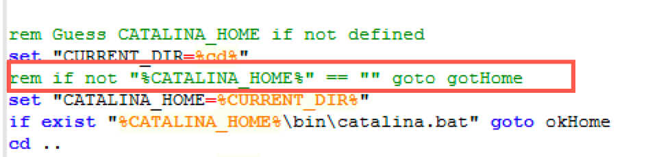 使用rem将语句if not "%CATALINA_HOME%" == "" goto gotHome注释掉。如下图所示: