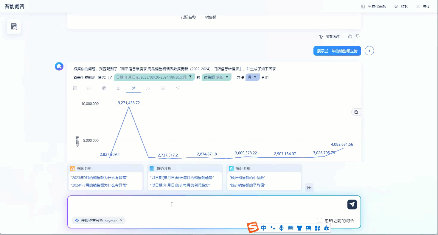 在对话框输入问题即可开始进行提问,FineChatBI 即可基于问题进行查询并给出回答。