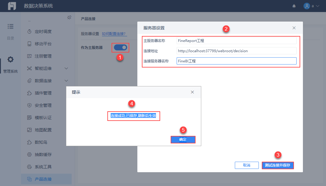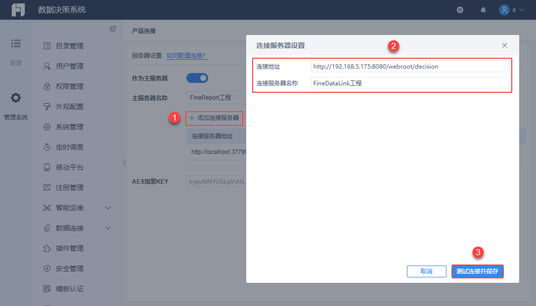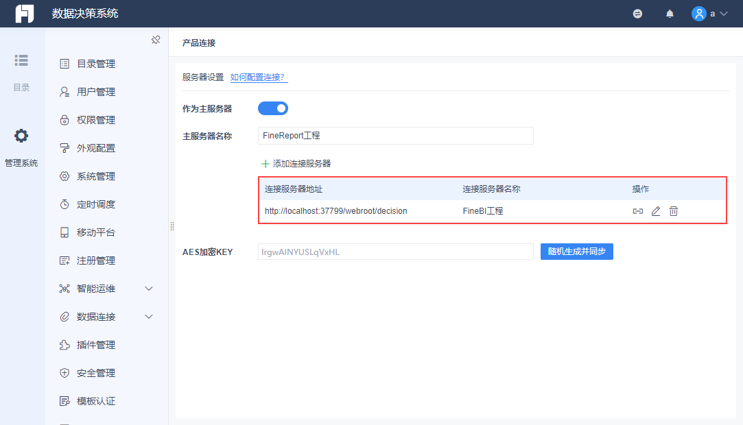 1)使用超级管理员帐号登录 FineReport 数据决策系统(主服务器),点击「管理系统>产品连接」,界面如下图所示: