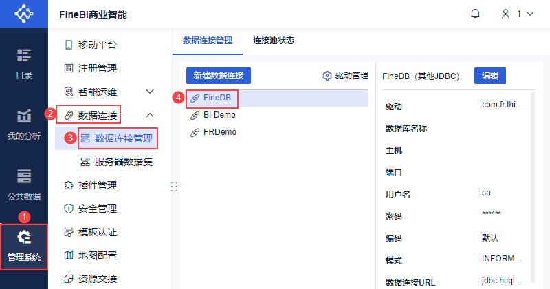 1)管理员登录 FineBI 系统,点击「管理系统>数据连接管理>驱动管理」,如下图所示: