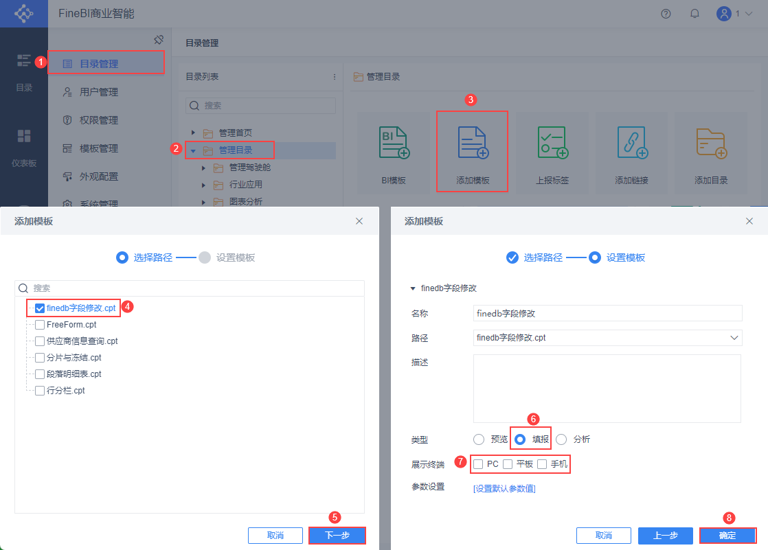 3)在「目录管理」中,添加该模板,类型选择「填报」,展示终端无需勾选(勾选可能会导致其他非管理用户看到)