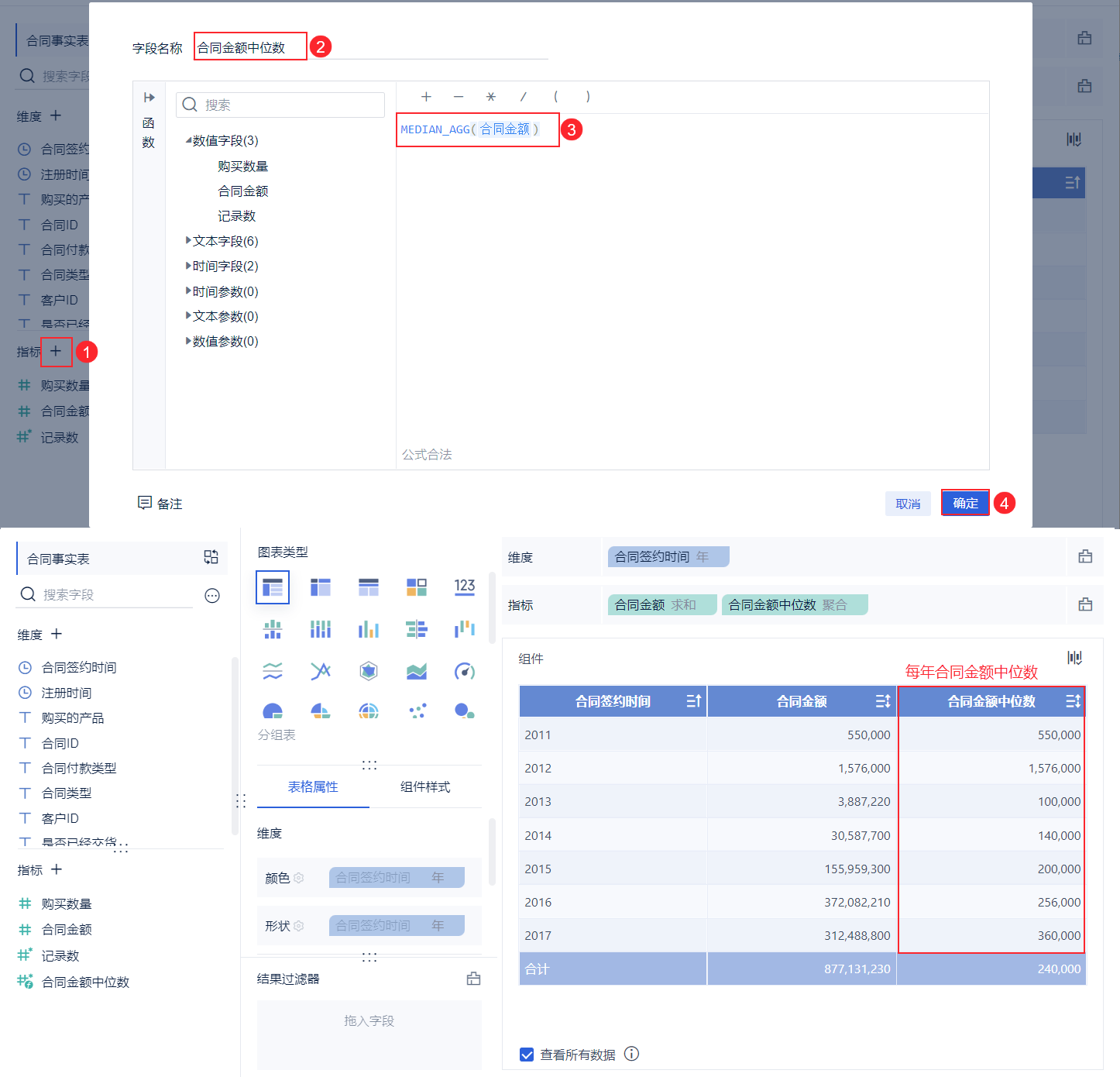 1)例如想要计算每年「合同金额」的中位数,则可以使用公式:MEDIAN_AGG(合同金额),如下图所示: