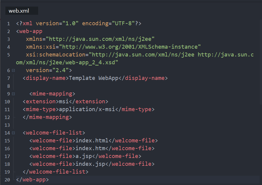 注:如果不存在该文件,请在webroot\WEB-INF 目录下新建 web.xml 文件。建议根据你的Tomcat版本,通过Tomcat官网获取相关原始文件。