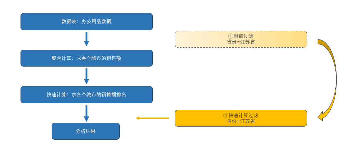 例如想要计算江苏省各城市在全国的排名,需要:①先对城市的销售额进行快速计算排名,②再筛选出江苏省的数据。就需要将对省份的过滤条件,调整到第 4 层级。