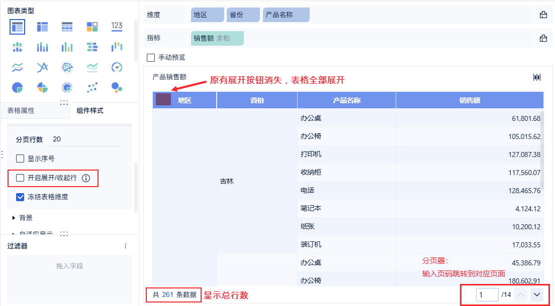 不开启「展开/收起行」功能时,表格下方会出现总行数信息。用户可以在右下角分页器中输入页码跳转到对应页面。