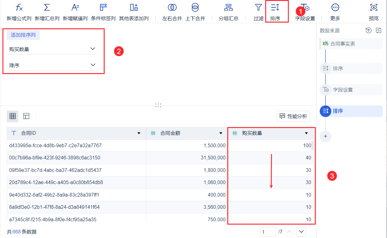 数据先按照「购买数量」降序,再按照「合同金额」降序。可以在表头下拉设置。如下图所示: