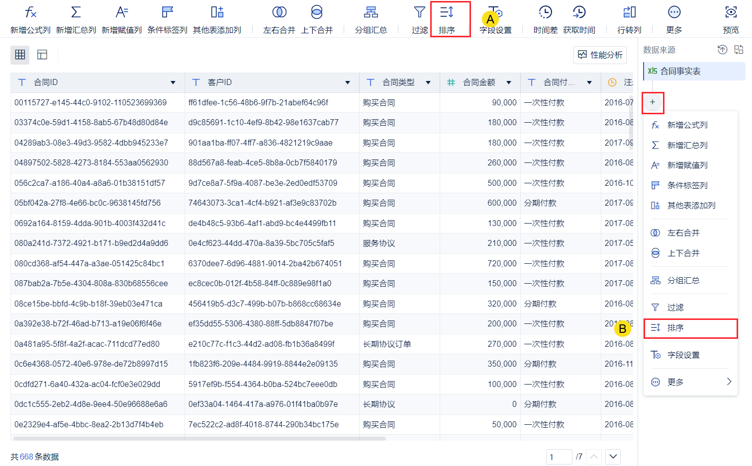 排序入口可以直接点击顶部「排序」;或者点击右侧「+>排序」。如下图所示:
