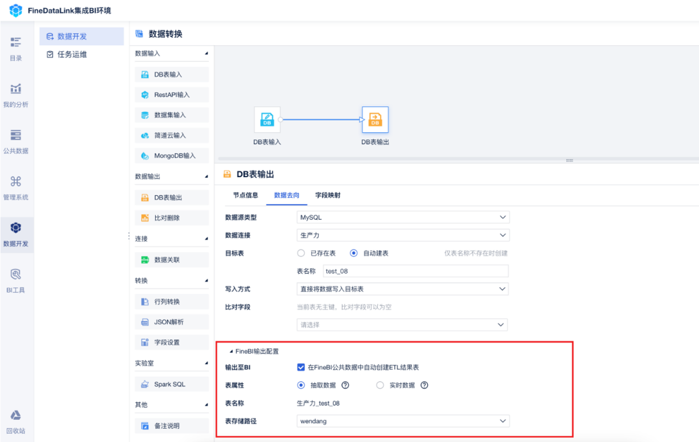 数据开发模块具备数据预处理能力,对来源于各个业务系统的多源异构数据,通过可视化低代码方式进行数据集成和清洗,通过高性能的ELT、ELT双核引擎获取标准的、干净的数据,直接通过输出至BI的ETL数据集,提供给后续的数据自助分析使用。数据开发模块具备以下数据同步、数据转换、SQL脚本、任务调用等十种能力。