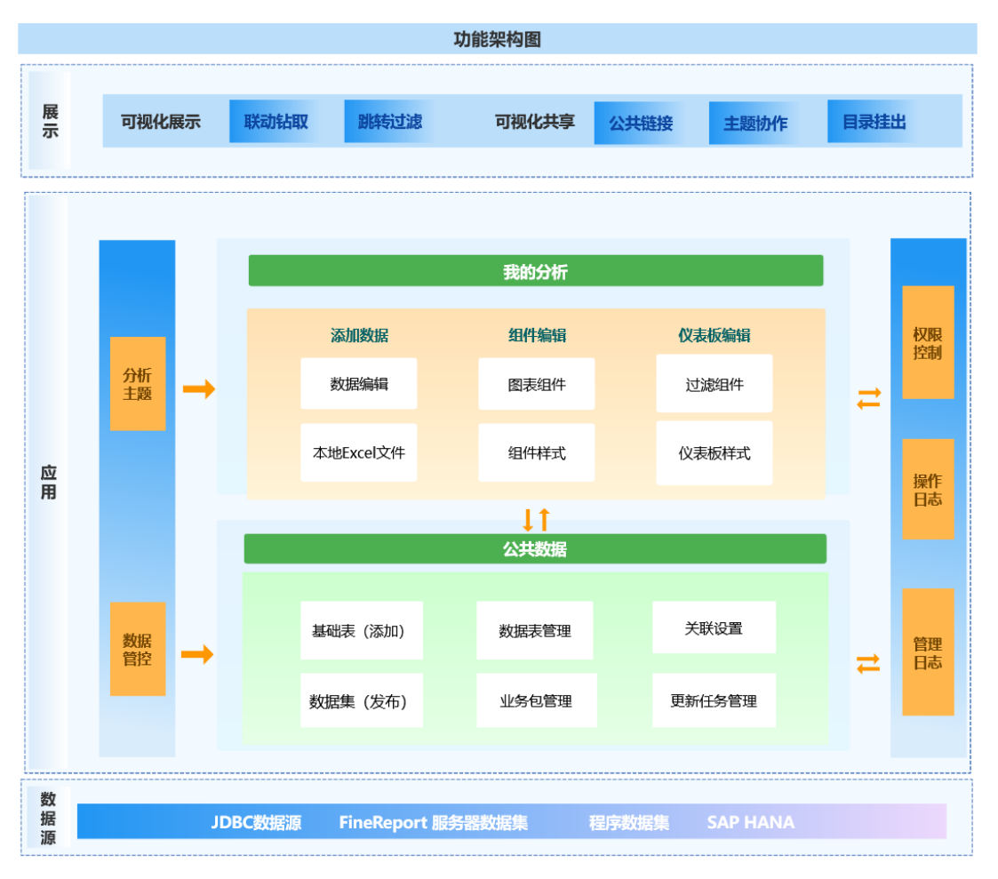 FineBI 拥有几大核心功能,分别为「全新的分析路径」、「数据管理」、「数据编辑」、「超强函数」、「数据可视化管理」、「数据协作共享」、「企业级应用能力」。