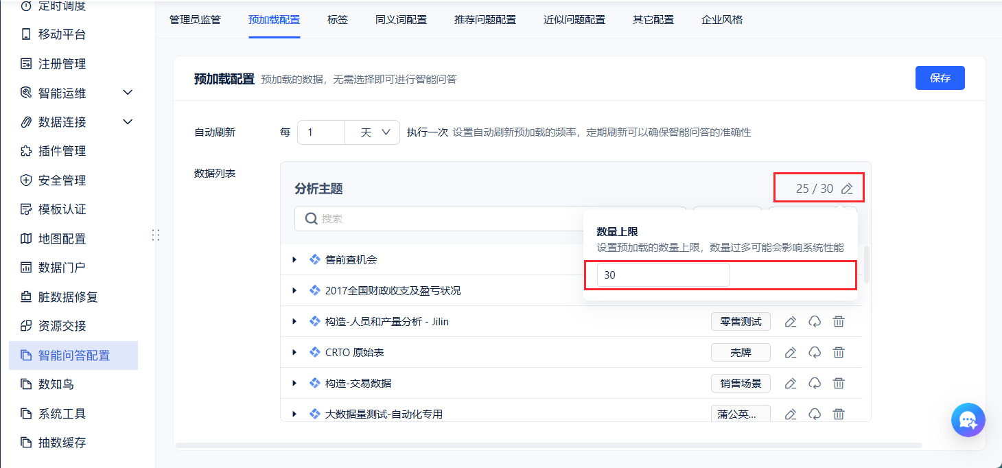 在完成预加载配置之后,还需要为相关用户配置预加载数据的使用权限,用户只可以对有权限的预加载数据进行提问。