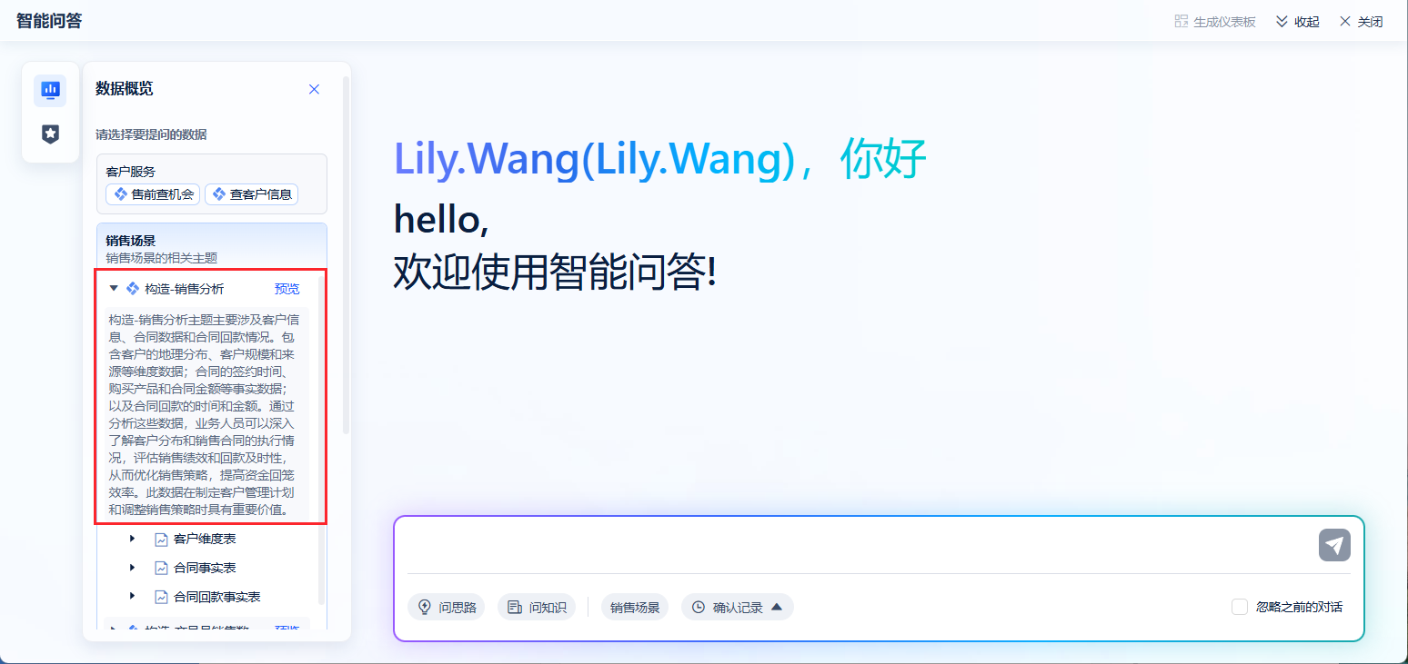 FineChatBI 支持管理员为业务用户预设常用的分析主题与标签体系,并设置权限。当业务员用户进入提问界面时,左侧导航栏自动展示权限范围内的预设内容,点击后即可对选择的数据范围进行提问。