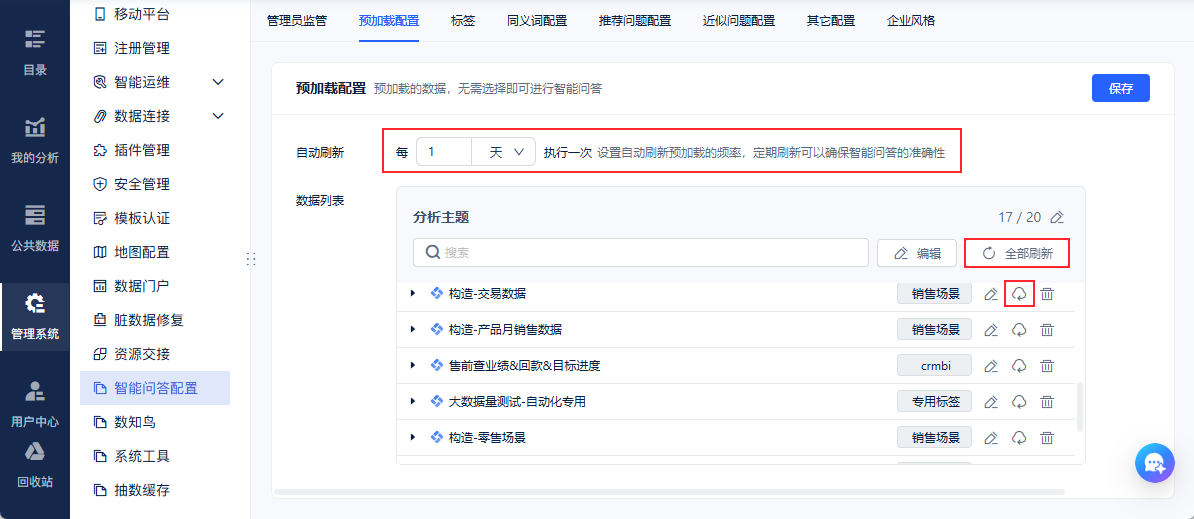 由于数据库中的数据是会变动的,所以需要刷新预加载数据中维度值,确保问答BI能获取到最新的维度值。
