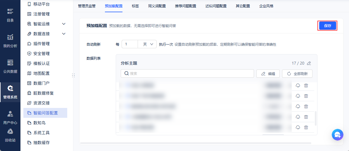 1)管理员进入「管理系统>智能问答配置」,进入「预加载配置」,如下图所示: