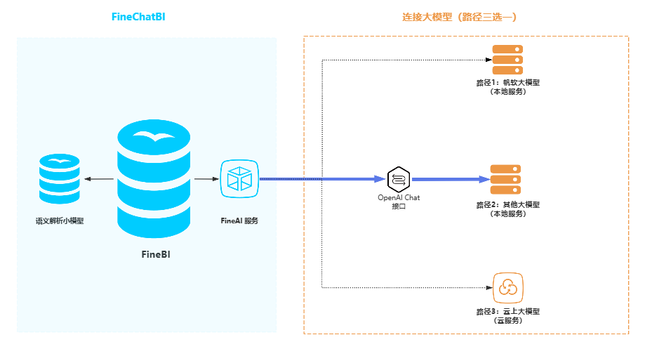 本文将介绍 FineChatBI 如何连接其他大模型(图中蓝色连线部分),连接其他本地大模型需要进行接口改造,连接步骤大致如下: