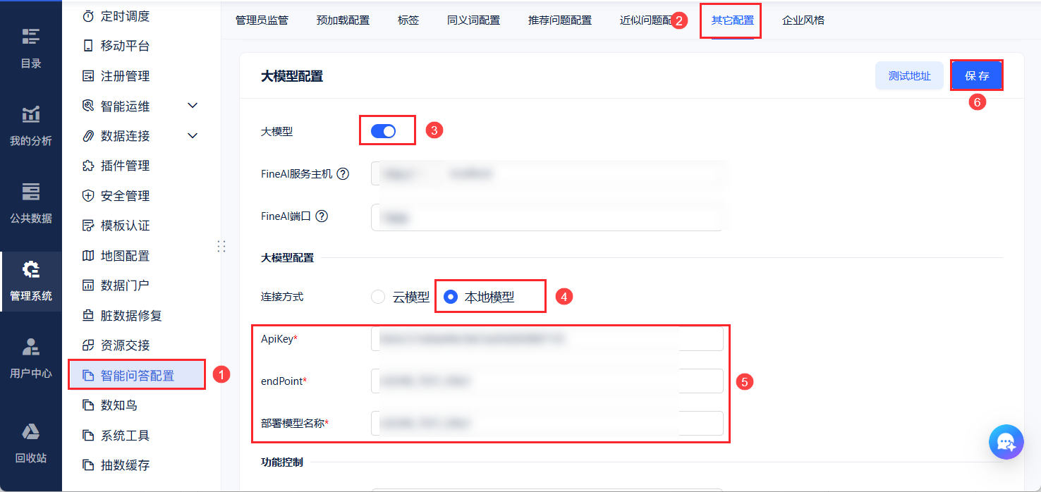 进入「智能问答配置>其他配置>大模型配置」,配置本地服务信息,再点击保存。如下图所示: