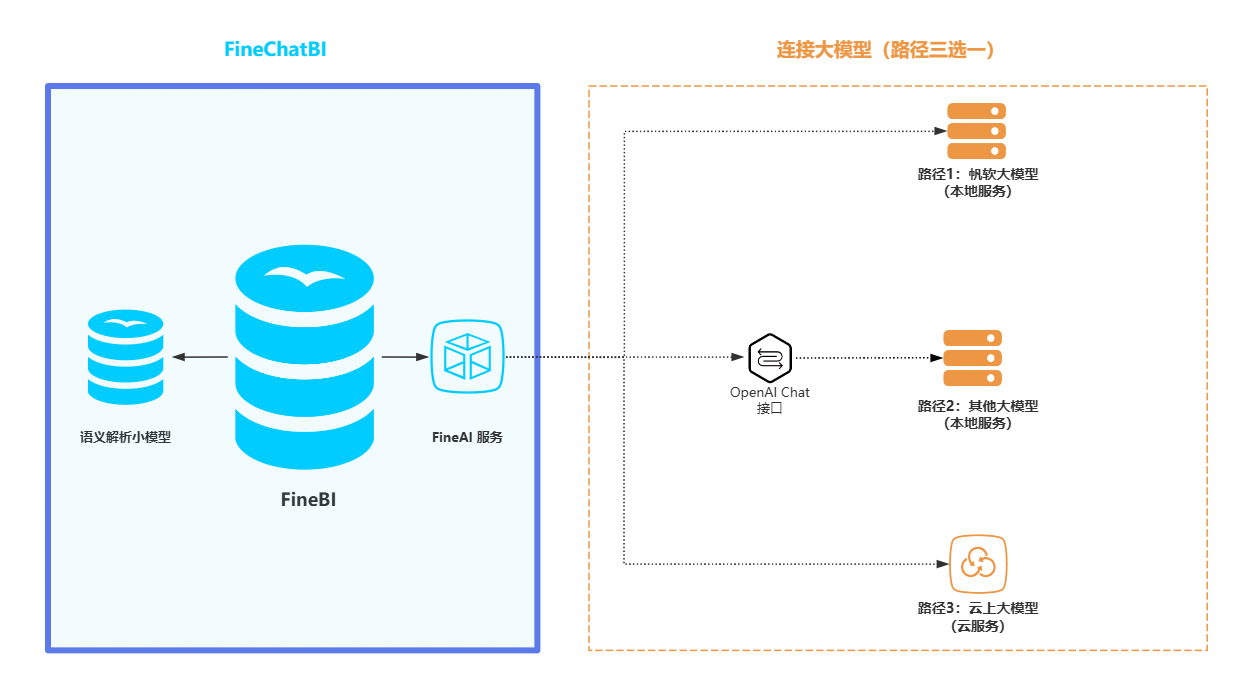 FineChatBI 以 FineBI 为底座,以「语义解析小模型」为核心。语义解析小模型可以将用户提问的自然语句转化为可执行的数据查询语句,系统依据解析后的查询语句可返回分析结果。详情部署操作请参见:FineChatBI 部署