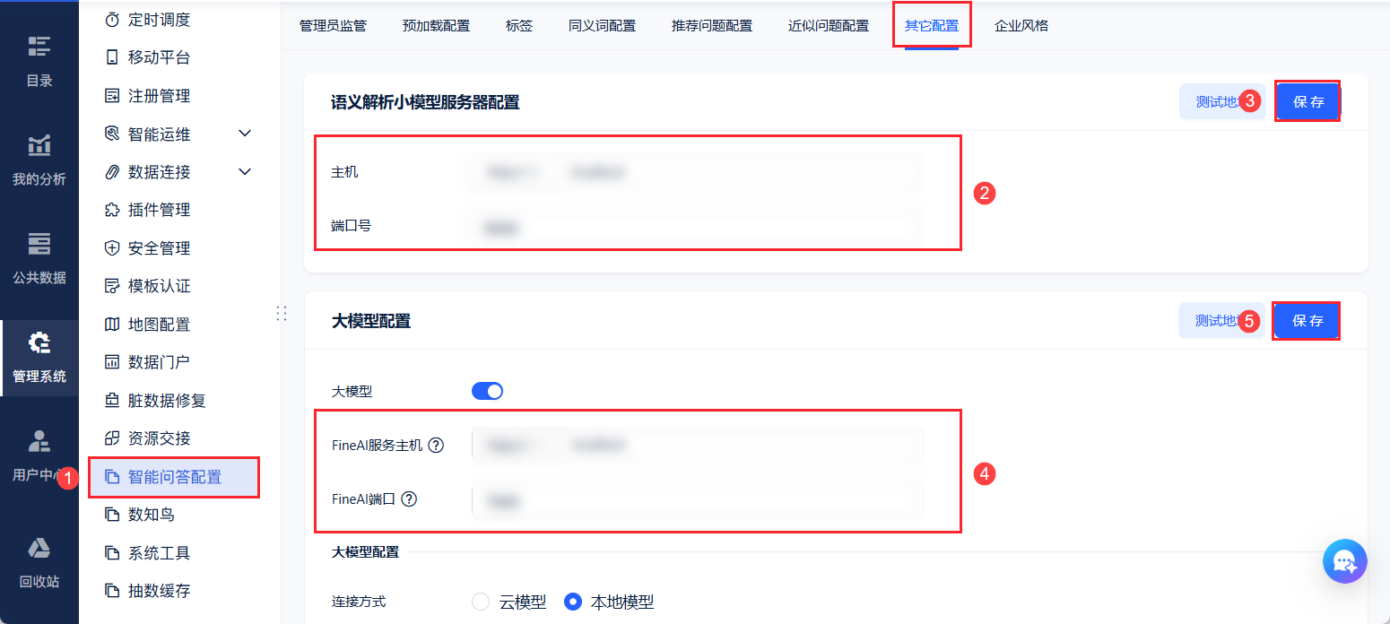 3)完成后刷新页面,选择「管理系统>智能问答配置>其他配置」,配置服务器 ip 和端口,点击保存即可。如下图所示: