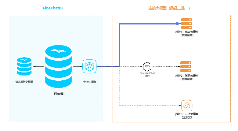 本文将介绍 FineChatBI 如何连接帆软大模型(图中蓝色连线部分),总共需要有三个步骤: