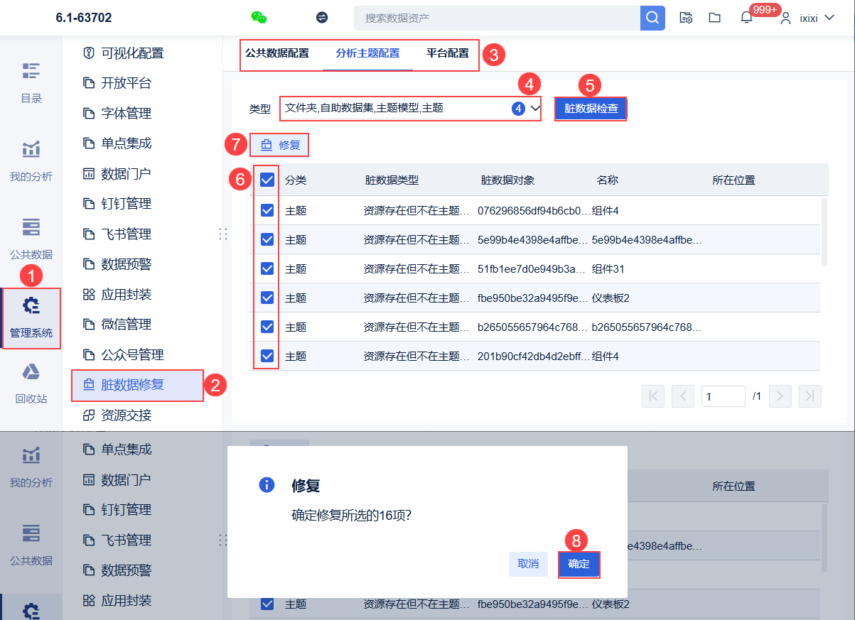 FineBI提供「脏数据修复」功能,帮助管理员排查FineBI配置中存在的脏数据,支持自动/手动修复