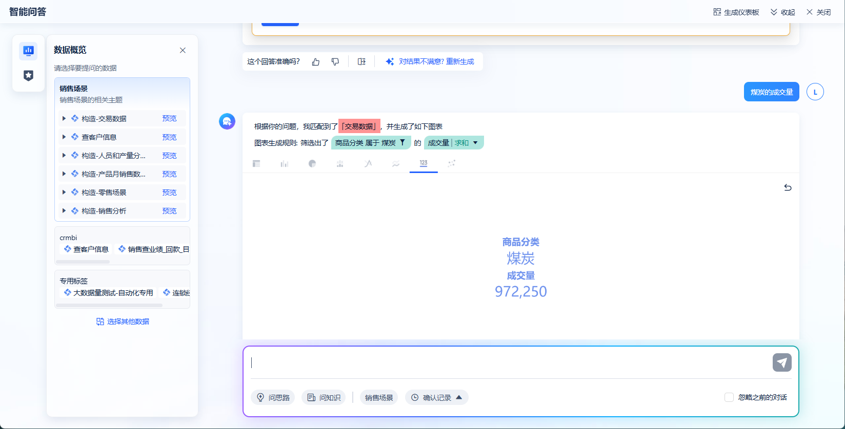 标签内自动切换主题 继续提问:煤炭的成交量,若用户提问的问题关联的分析主题与当前使用的分析主题不同,系统会依据提问问题,智能识别并自动切换至对应的分析主题。如下图所示: