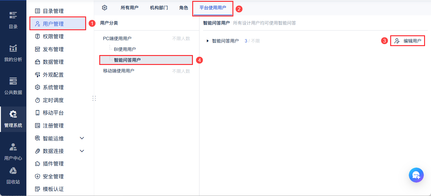 智能问答的使用权限在 V3.22.0 的版本中改为由用户类型控制,【设计用户】和【智能问答用户】拥有 FineChatBI 的使用权限。