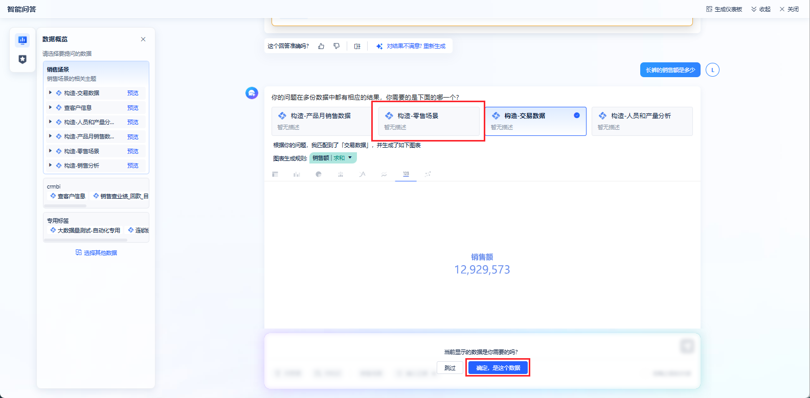 若问题涉及标签内多个分析主题的数据,系统会展示相关分析主题供用户选择。当用户选择「确定,是这个数据」 后,后续再提出此问题,系统将自动切换并匹配该主题,无需重复选择。