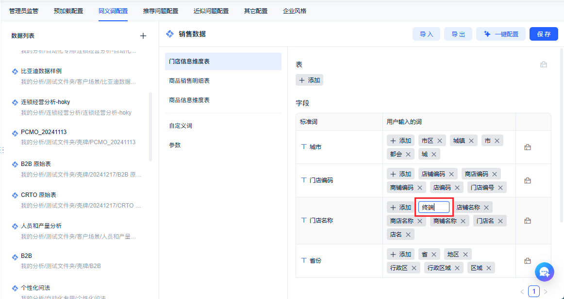 2)用户可以对字段名、维度枚举值、参数和自定义词配置同义词,如下图所示: