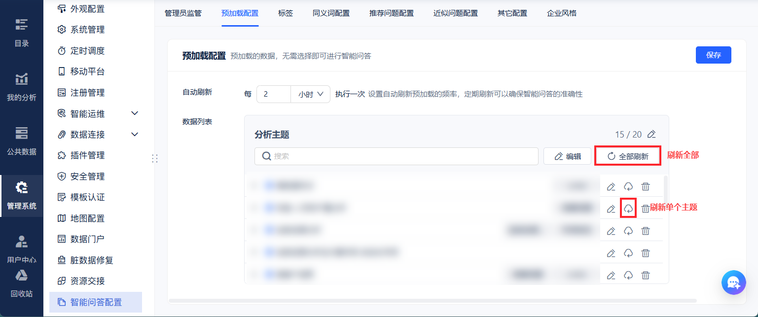 进入「预加载配置」界面,完成数据刷新操作后,配置的同义词才能正式生效。如下图所示: