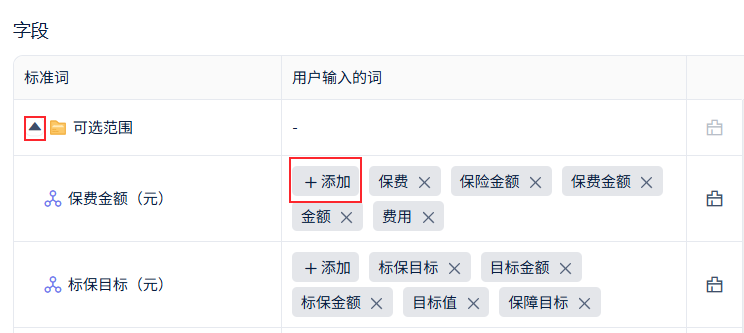 | 标准词 | 业务人员提问场景 | 添加同义词 |