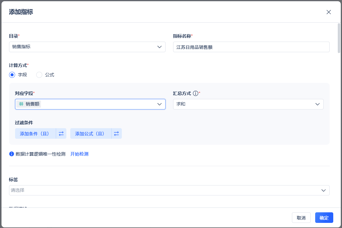 1)点击「添加指标」输入指标名称,选择指标所在目录;计算方式选择「字段」,即可对添加的字段进行汇总、过滤。