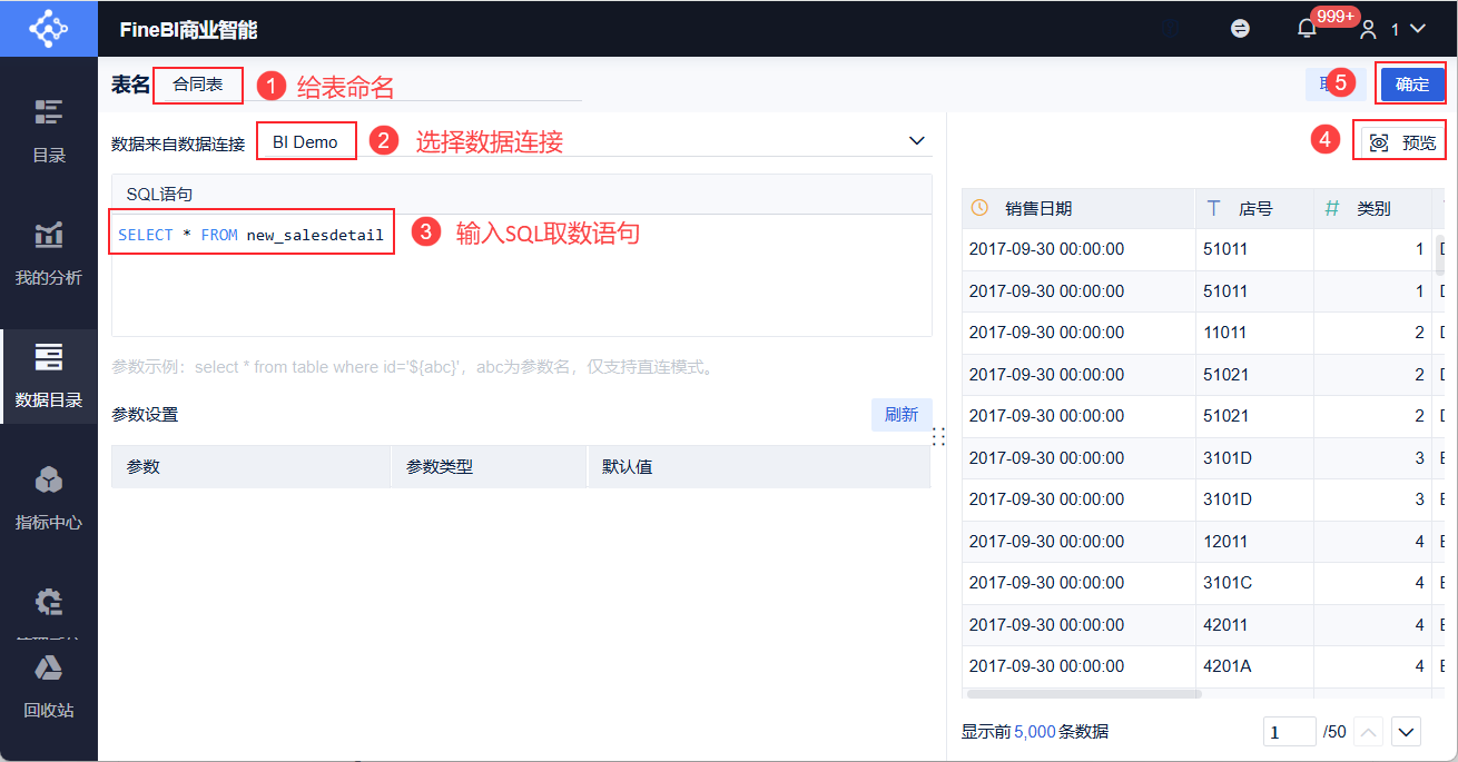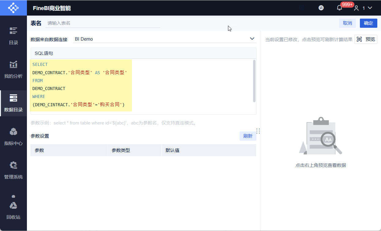 选择需要使用的数据连接后,就可以输入 SQL 语句取数。点击「预览」查看是否取数正确,最后点击「确定」添加表。如下图所示: