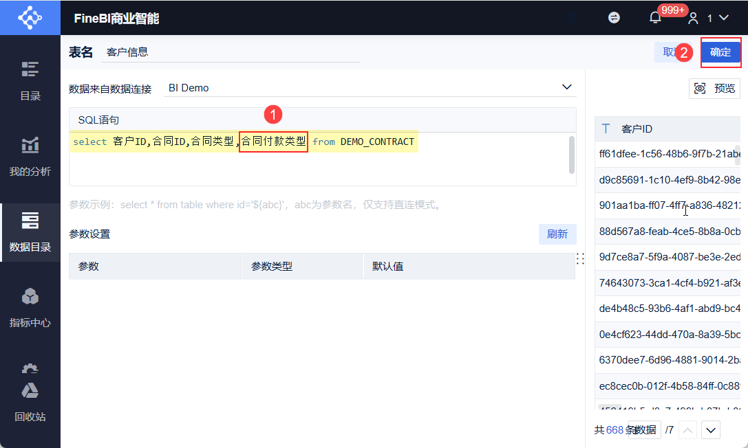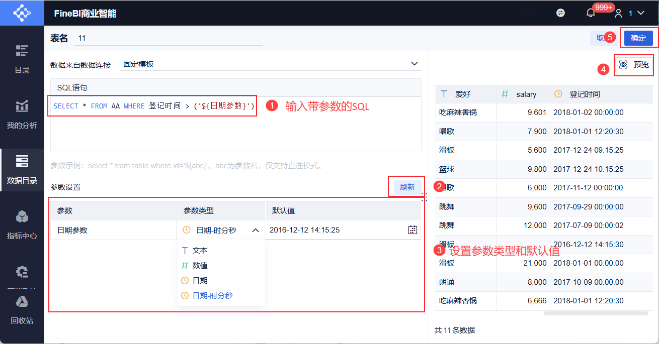 注:添加 SQL 数据集时,输入的 SQL 语句中不能带分号,否则若在字段设置处修改了字段类型,会导致数据集更新失败。