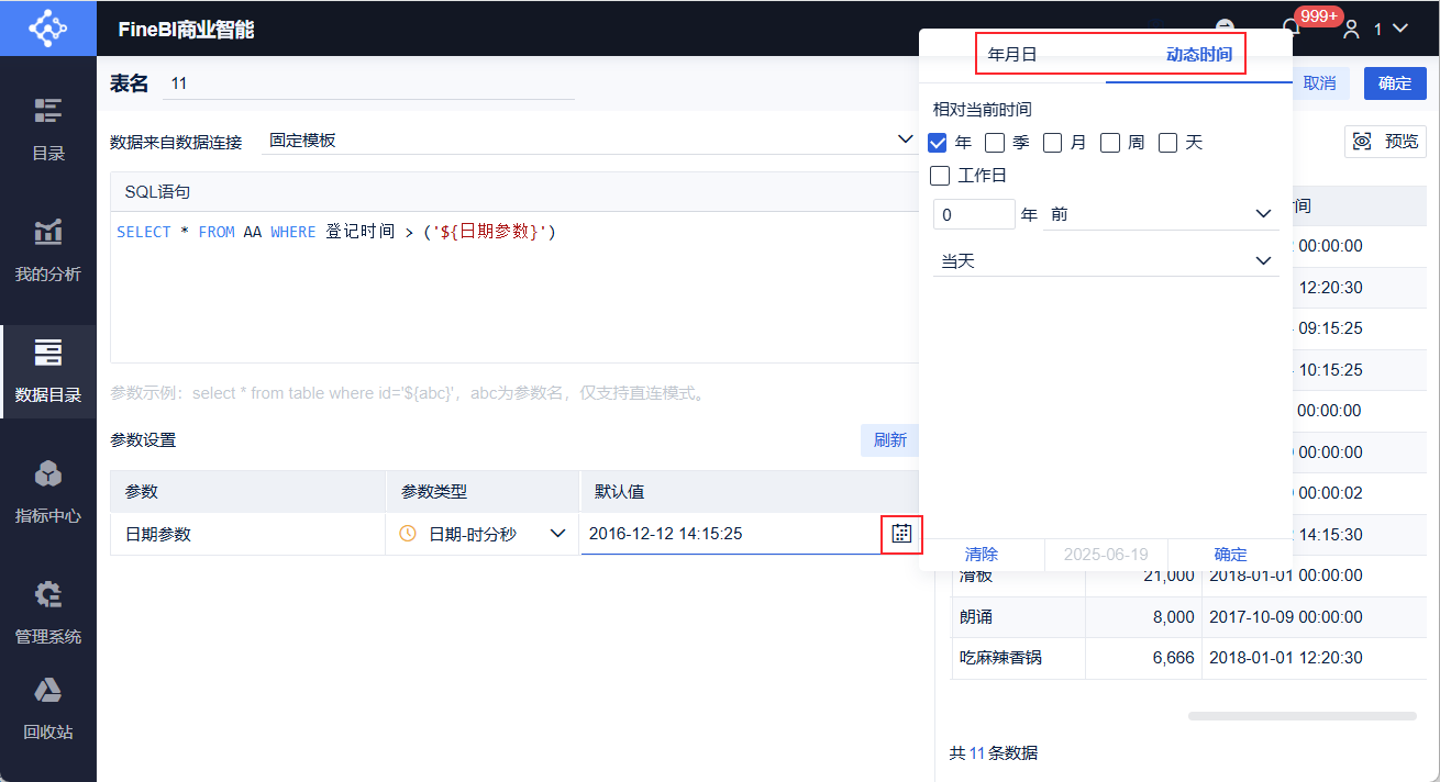 在设置时间参数的默认值时,我们可以设置动态时间,比如说昨天、上个月等。