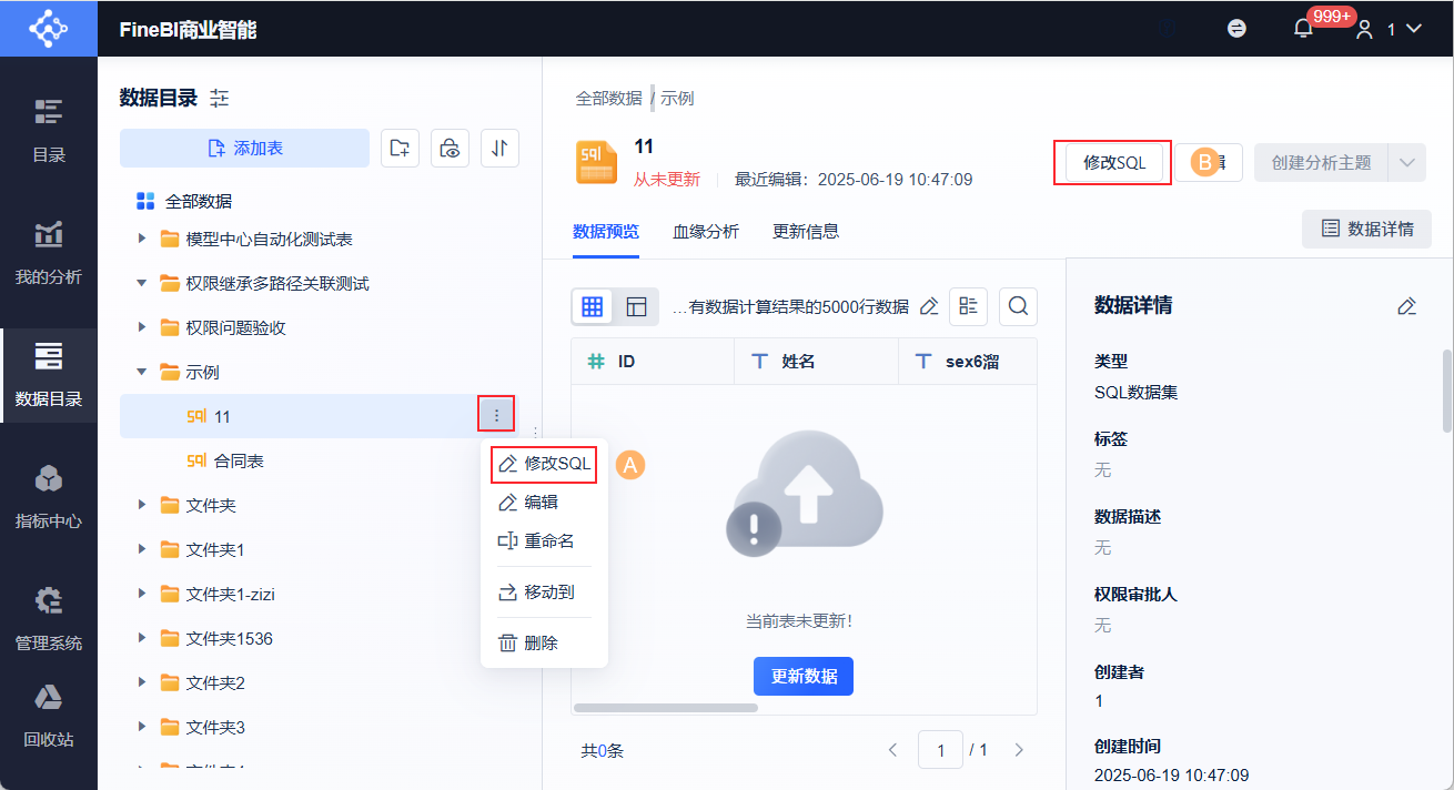 SQL 数据集在添加完成后,用户可从下图两个入口修改 SQL 语句以及参数设置。