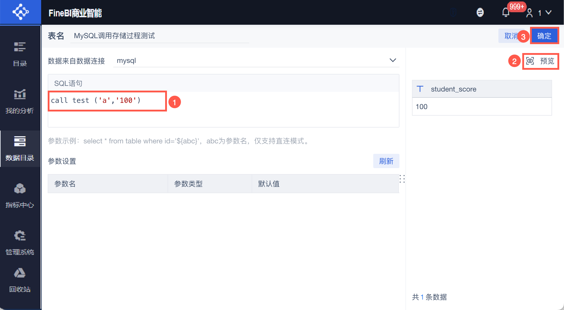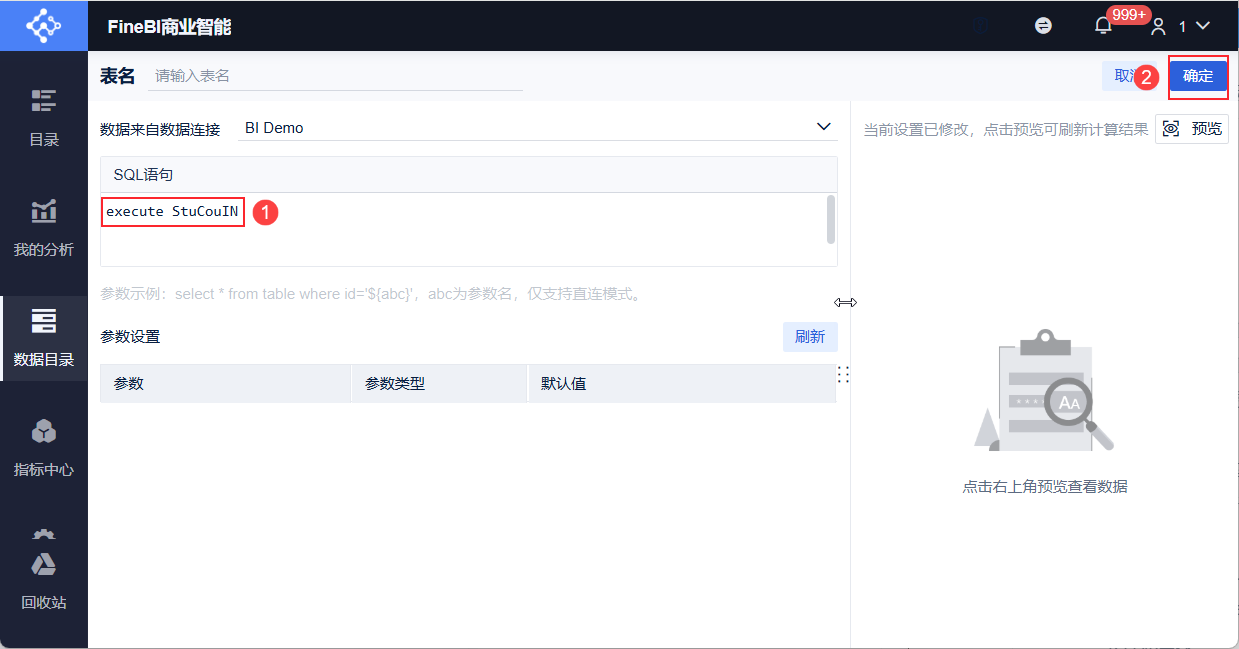 在 SQL 语句框中输入call + 存储过程名(),点击「预览」查看调用结果,点击「确定」即可保存该数据集。