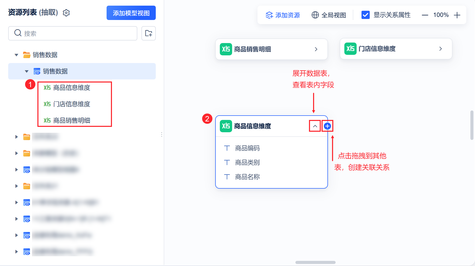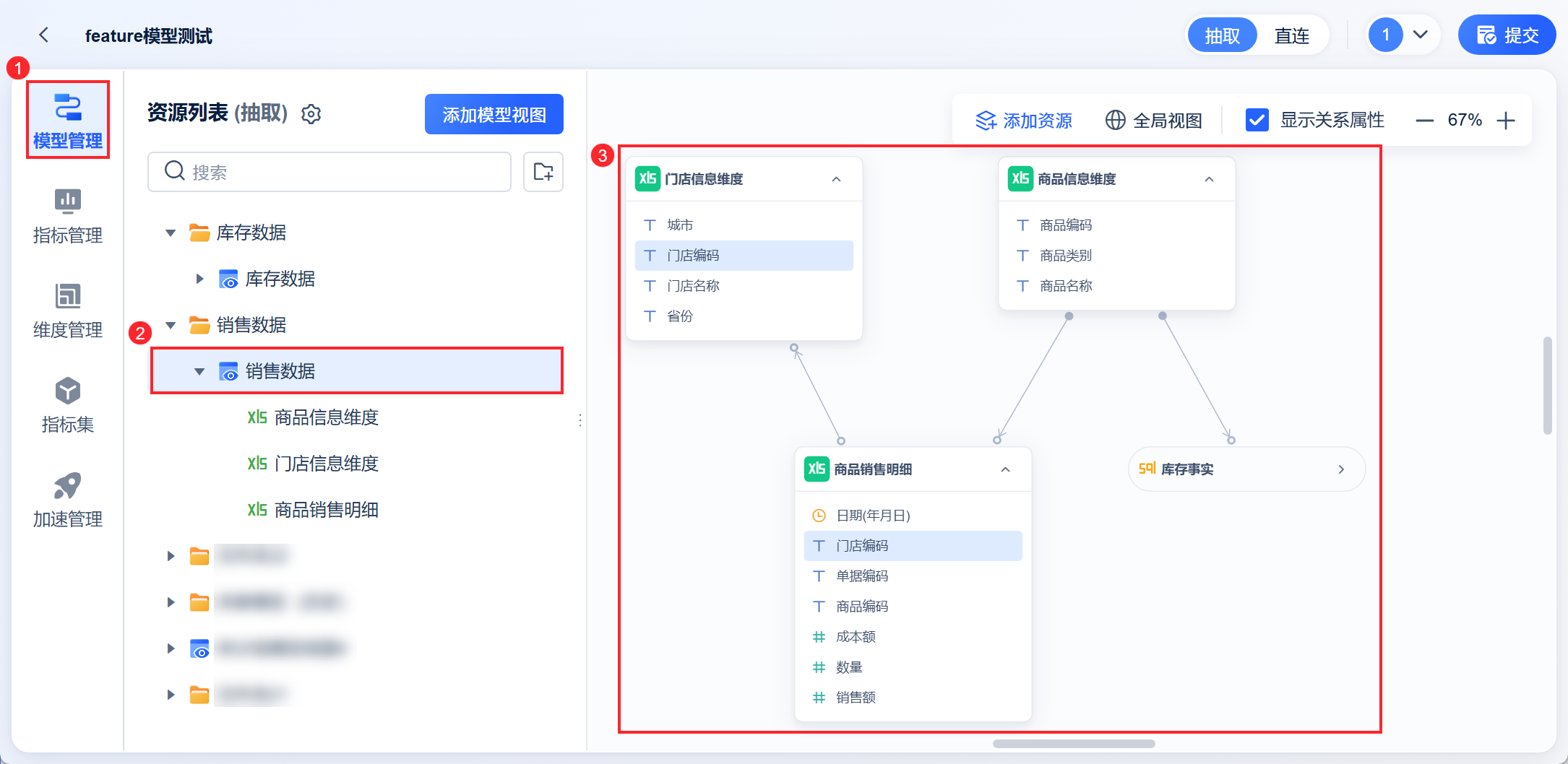 「模型管理」中,可添加数据资源并建立关系;还支持对已有的关系进行管理。