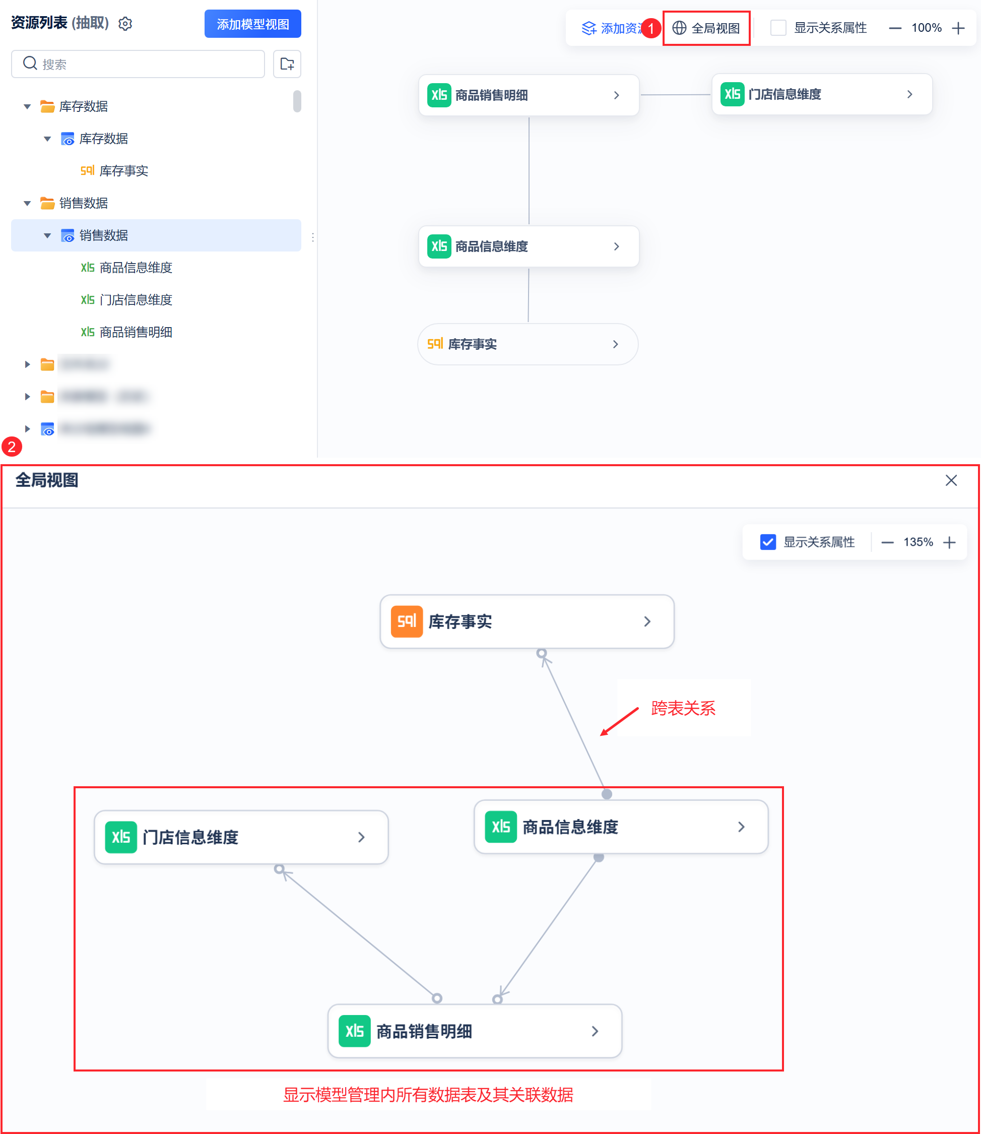 点击右上角「全局视图」,即可查看模型管理内所有资源及其关系。如下图所示: