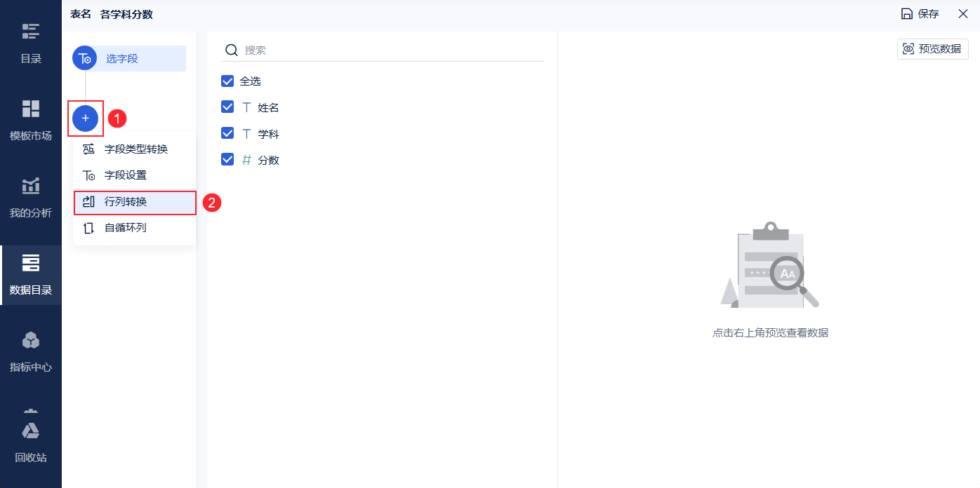只有【抽取数据】的【基础表】有本文行转列的功能。