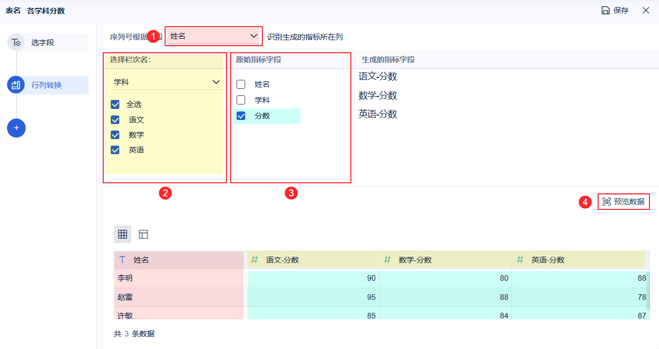 ②:依据该列的字段值,生成新字段的表头。由于我们想生成的新列「语文、数学、英语」都来自字段「学科」,所以选择「学科」。
