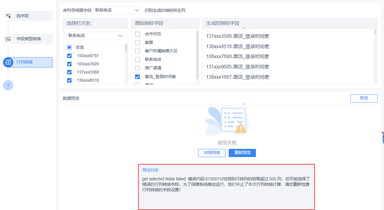 所以系统会自动打断超过 500 列的行列转换操作,并提示:错误代码:61300112检测到行转列的结果超过 500 列,您可能选择了错误的行列转换字段。为了保障系统稳定运行,我们中止了本次行列转换计算,请您重新检查行列转换的字段设置!