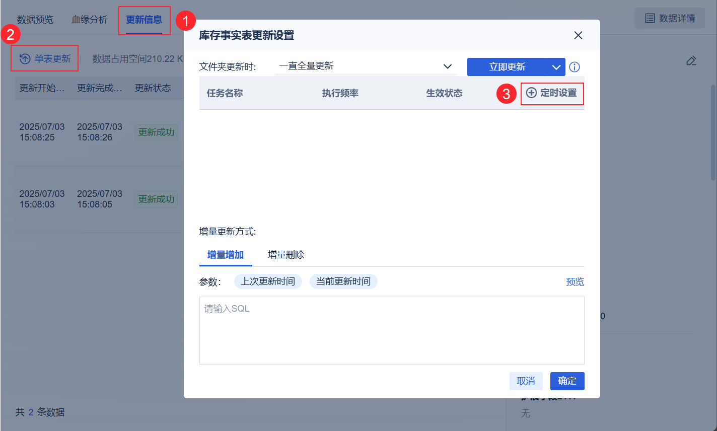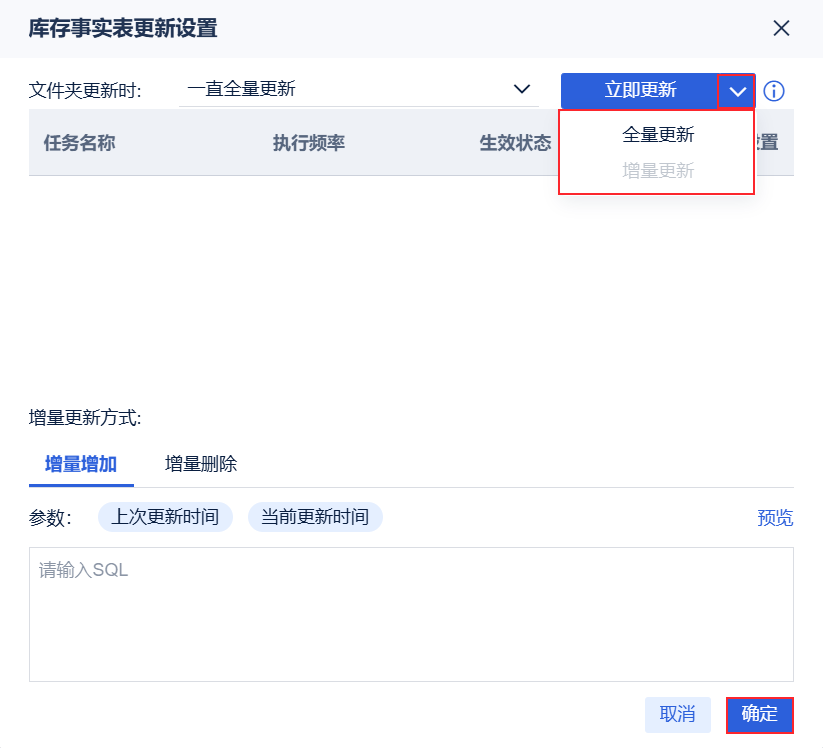 定时更新设置框:是针对该表进行的单表更新,可以选择全量更新、增量更新。