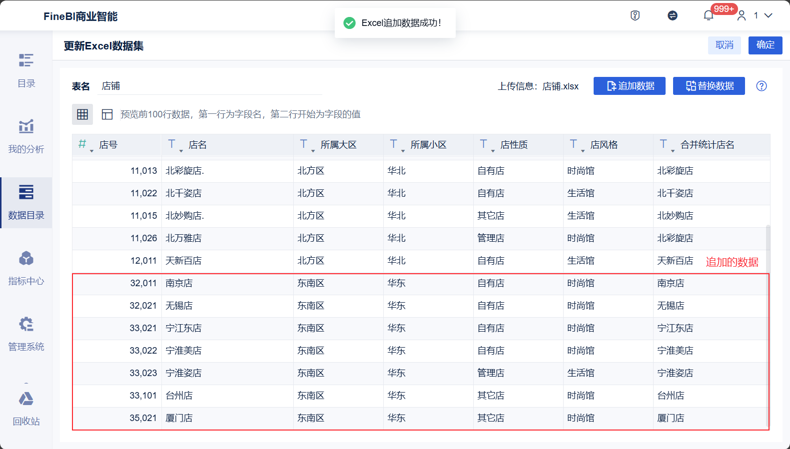 3)追加数据成功后,页面提示「Excel 追加数据成功」,并可以在最后看到追加的华东的数据。如下图所示: