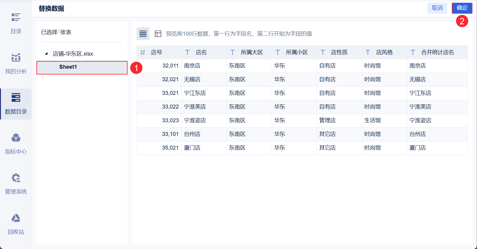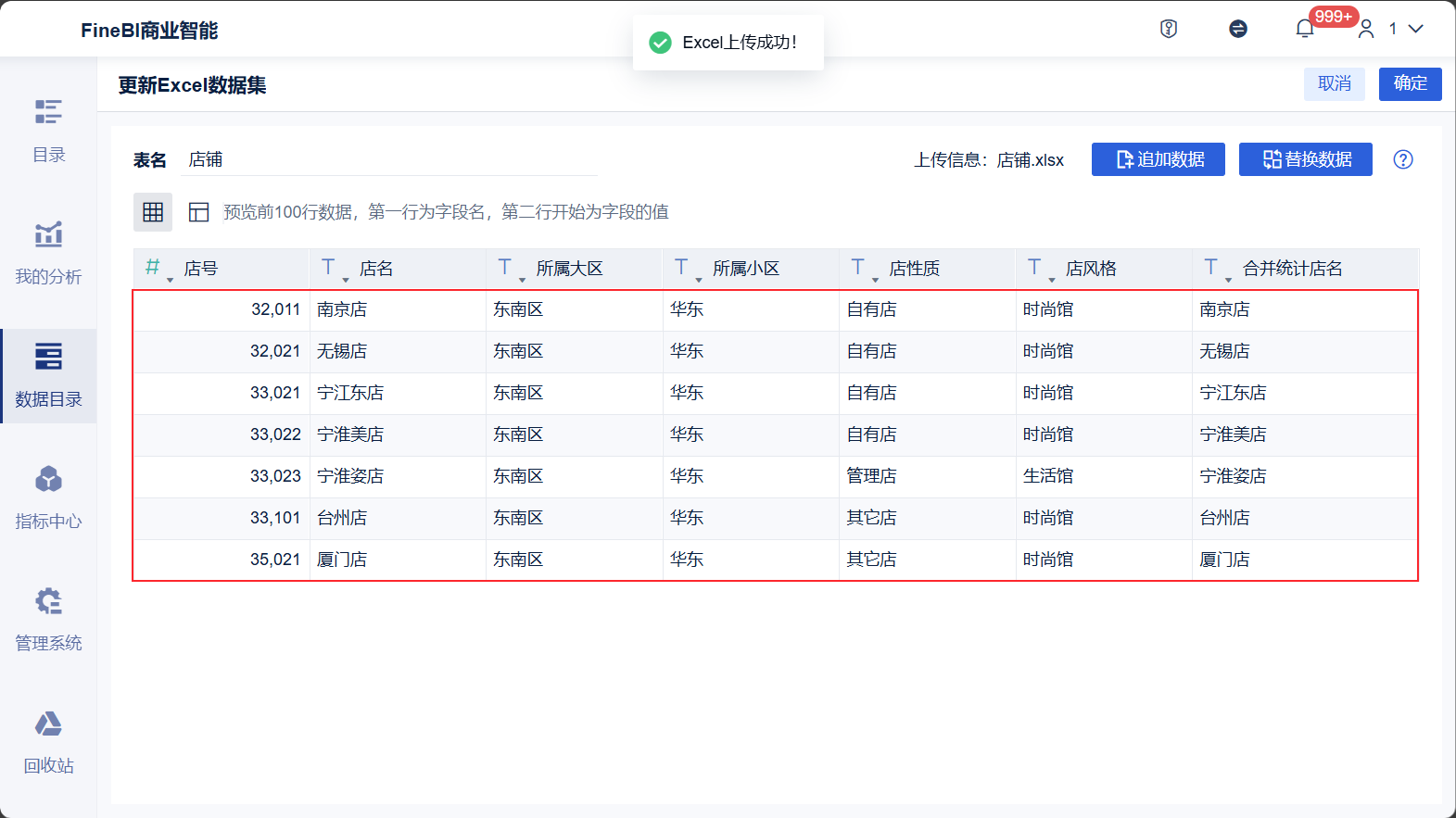 3)上传成功后, FineBI 提示「Excel 上传成功」,成功将数据替换为「华东」地区的数据,如下图所示: