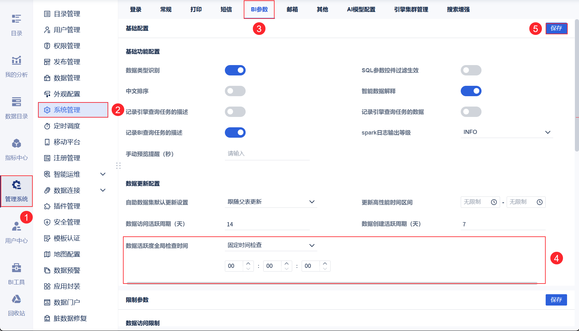 在「管理系统>系统管理>BI参数>数据更新配置」中,支持设置数据访问活跃周期、数据创建活跃周期、数据活跃度全局检查时间