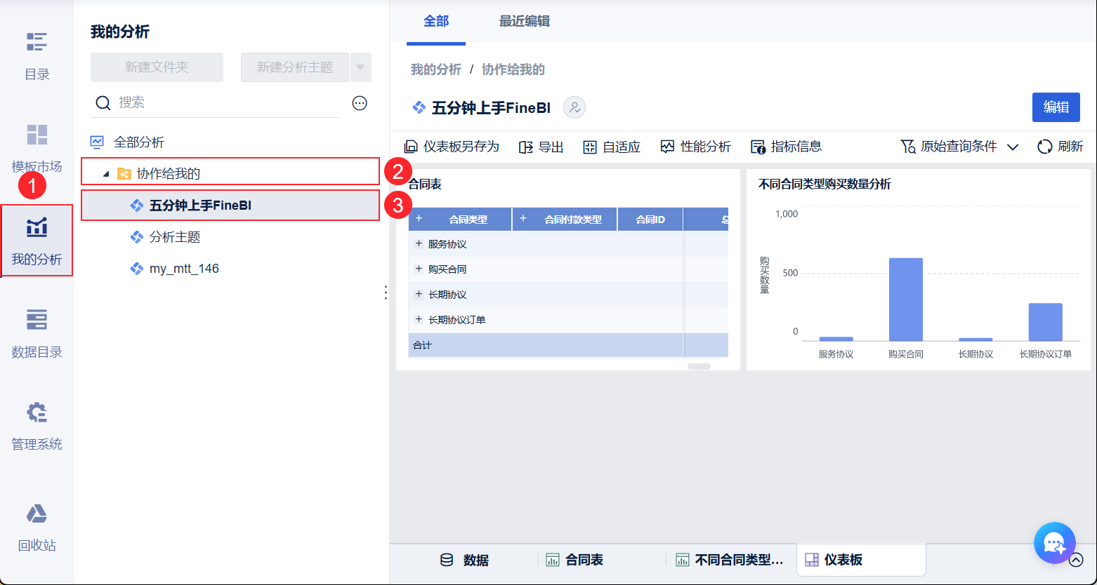 FineBI 支持用户将数据通过可视化图表呈现,更直观、深层次的观察数据,并支持在组件中对数据进行分析。接下来,我们将合同数据使用可视化图表展现。